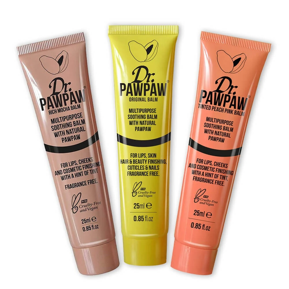 Dr. Paw Paw Original Balm hydrates and nourishes lips, skin and cuticles. It soothes dry, cracked, irritated and sensitive skin such as hands, elbows and heels. Use for adding finishing touches to hair and smoothing brows. Also helps with insect bites and minor abrasions. Our Tinted balms offer the same hydrating and nourishing formula. Adding a buildable lip & cheek tint to take you from beach to bar! Pack contains: 1 x Dr. Paw Paw Rich Mocha Balm 25ml, 1 x Dr. Paw Paw Original Balm 25ml & 1 x Dr. Paw Paw Peach Pink Balm 25ml. All fragrance free.
