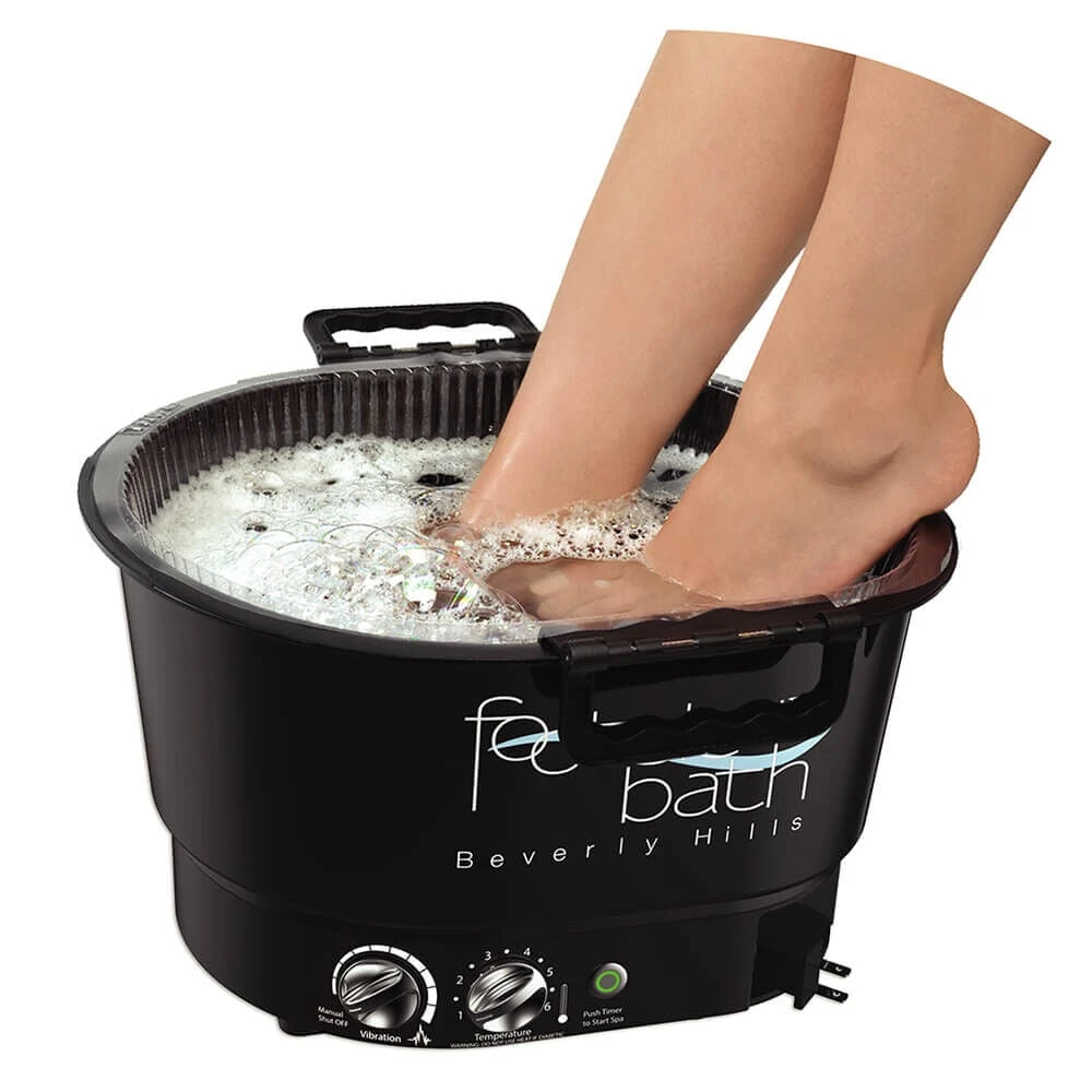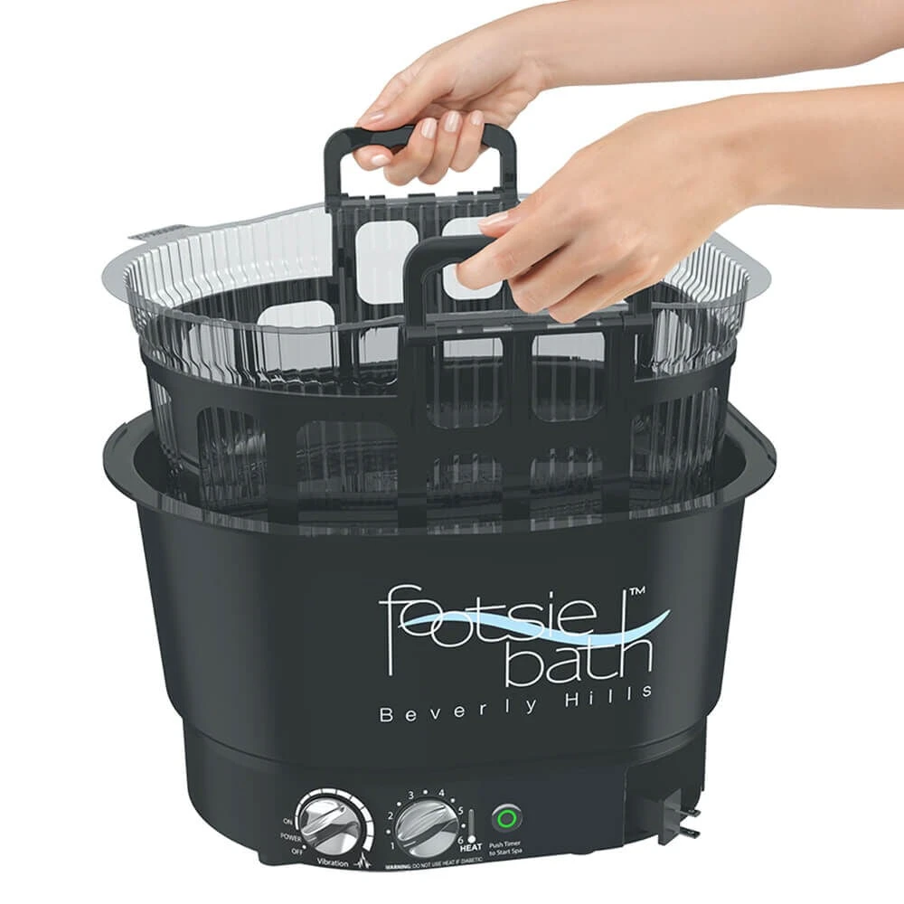 The first pedicure spa with a retractable cord, which is lightweight and durable FootsieBathâ„¢ is the most versatile foot spa on the market with a temperature controlled heater and ultra sonic vibration/massager. The carrier tray Eliminates the need to carry the Footsiebathâ„¢ from sink to pedicure station and back. It fits easily under most standard taps, making filling a breeze. Save time and space with the Carrier Tray from Footsiebath.â„¢ When finished with the pedicure, just lift Liner Carrier with used Liner. Once Liner is lifted, just empty out the water and dispose or recycle the Disposable Liner. What a big difference in cleaning!