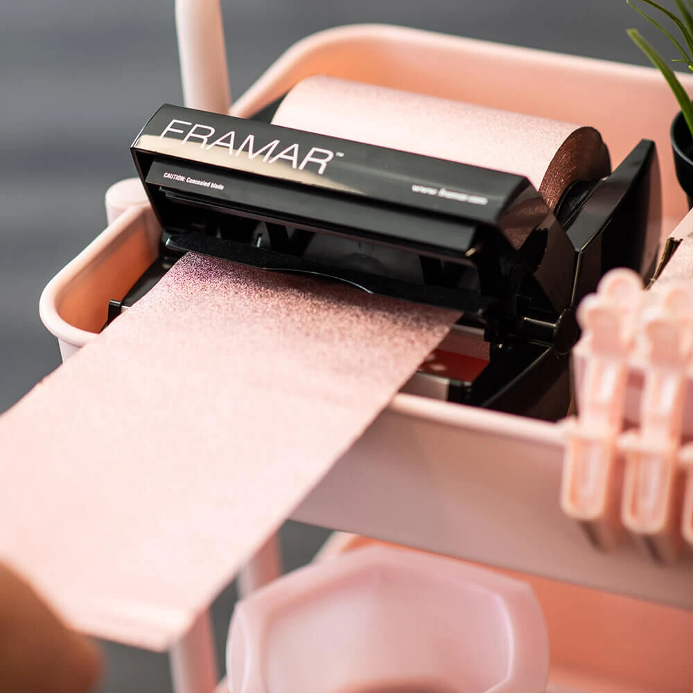 Let the good times roll! The Framar Rosé All Day Medium Embossed Foil Roll can be cut to any length, making in great for long hair and to help minimize waste. Complete with it’s own dispensing box with blade for easy use. The embossed texture grips hair so that you can breeze through any colour service. This unique colourful foil will turn heads and have every client posing for selfies while they process. 320ft, medium weight.