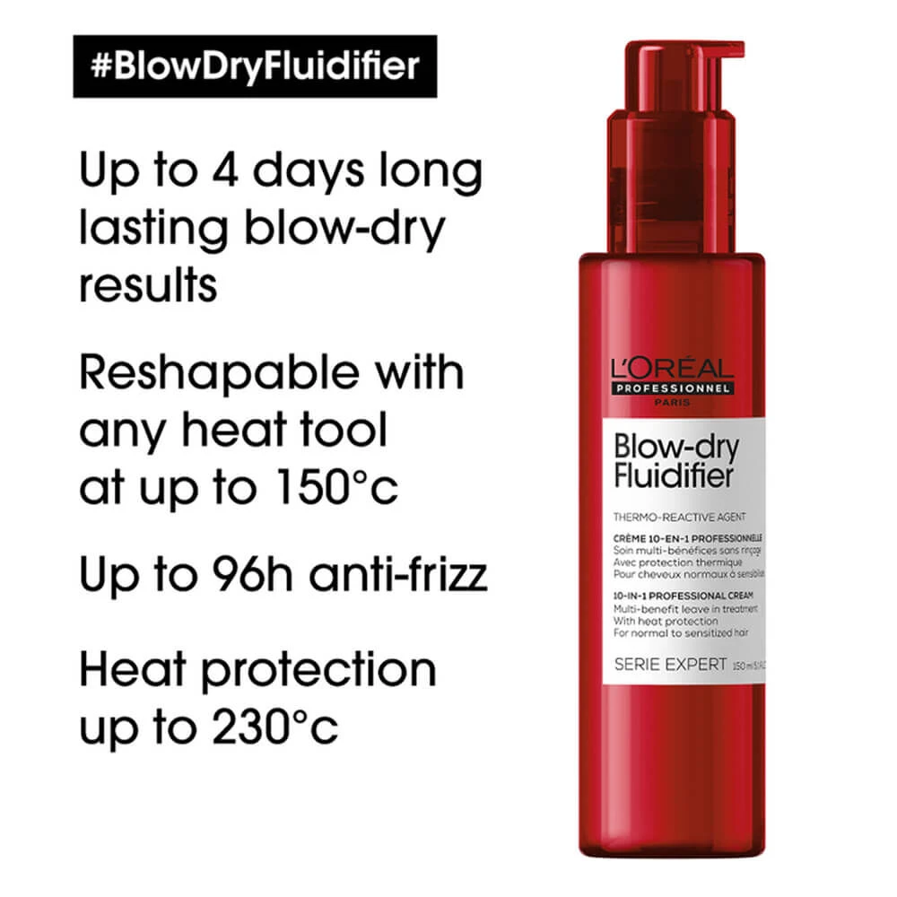 Set the motion for a long-lasting blow-dry with the L’Oréal Serie Expert Fluidifier. This 10-in-1 professional leave-in shape memory cream protects your blow-dry result for up to 4 days while providing heat protection up to 230°C. The lightweight formula is enriched with thermo-reactive agents that protect your style, and can be reactivated with heat tools (set to at least 150°C), giving you the freedom to reshape and restyle. Designed for normal to sensitized hair, this cream gives you 10 benefits to perfect your blow-dry result.