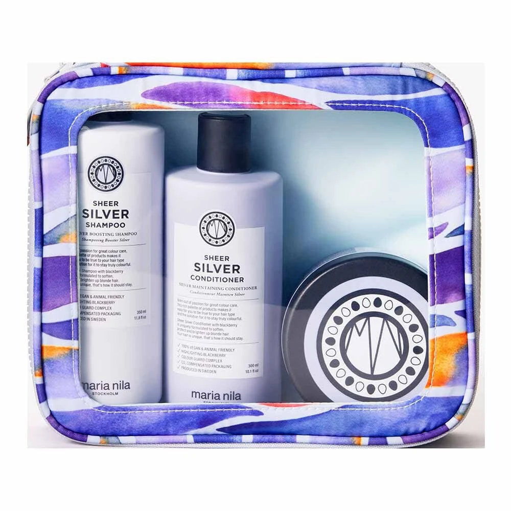 The Sheer Silver Beauty Bag is made out of recycled material and contains a full size shampoo, conditioner and hair mask that neautralises yellow shades in blonde hair and blackberry extract that adds shine.