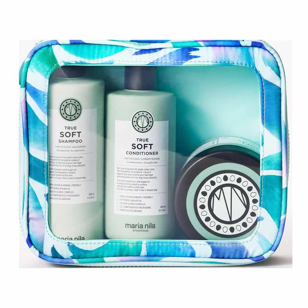 The True Soft Beauty Bag is made out of recycled material and contains a full size shampoo, conditioner and hair mask made with smoothing argan oil that preserve moisture and adds strength and radiance to dry hair.