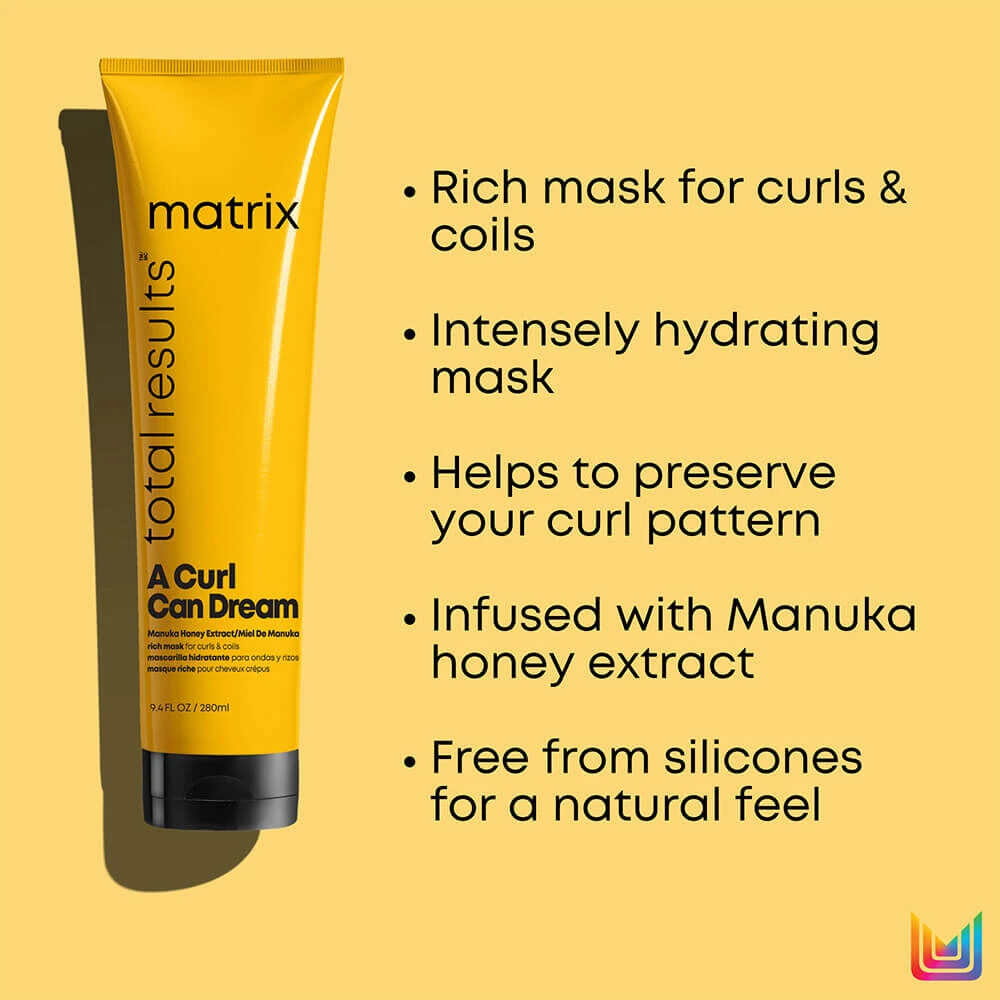 Matrix A Curl Can Dream Rich Mask for curls and coils, infused with Manuka honey extract. A deep hydrating mask that preserves the pattern of curls and coils. Formulated without silicones, parabens, mineral oils, petrolatum and paraffins