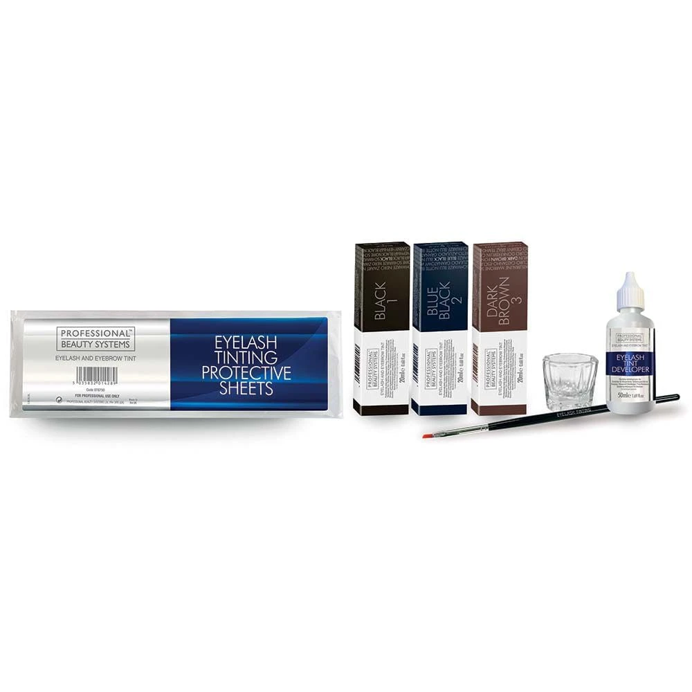 Contents: Black eyelash tint 20ml; Dark brown eyelash tint 20ml; Blue/black eyelash tint 20ml; Packet (96) protective sheets; Eyelash tint developer 50ml; Glass mixing dish and applicator brush.