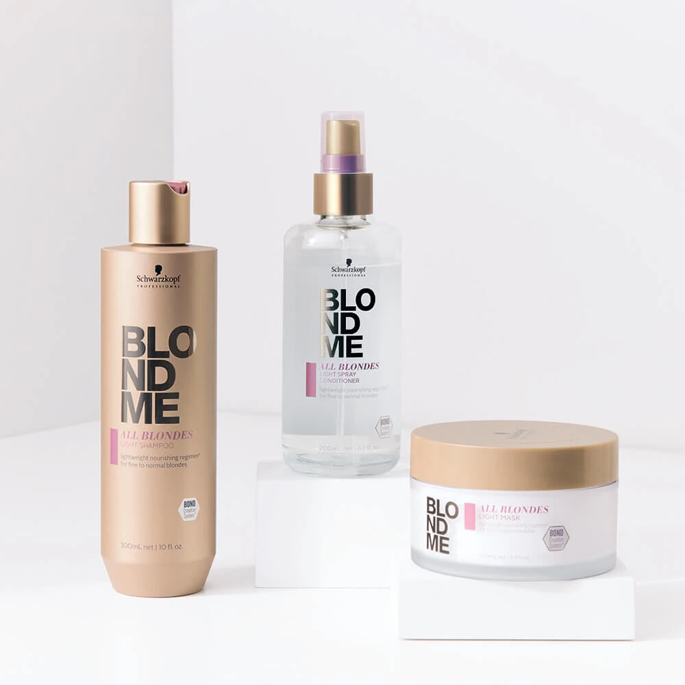 The BlondMe All Blondes Light Range with 3D Bond Creation Technology and Silk Protein Complex rebuilds and restores the inner hair bonds of fine to medium blonde hair. Formulated with Mulberry Silk Protein Complex known for its moisture binding properties, it helps to condition hair fibres without weighing the hair down. It gives the hair shine, suppleness and combability and provides static control to minimise flyaways.