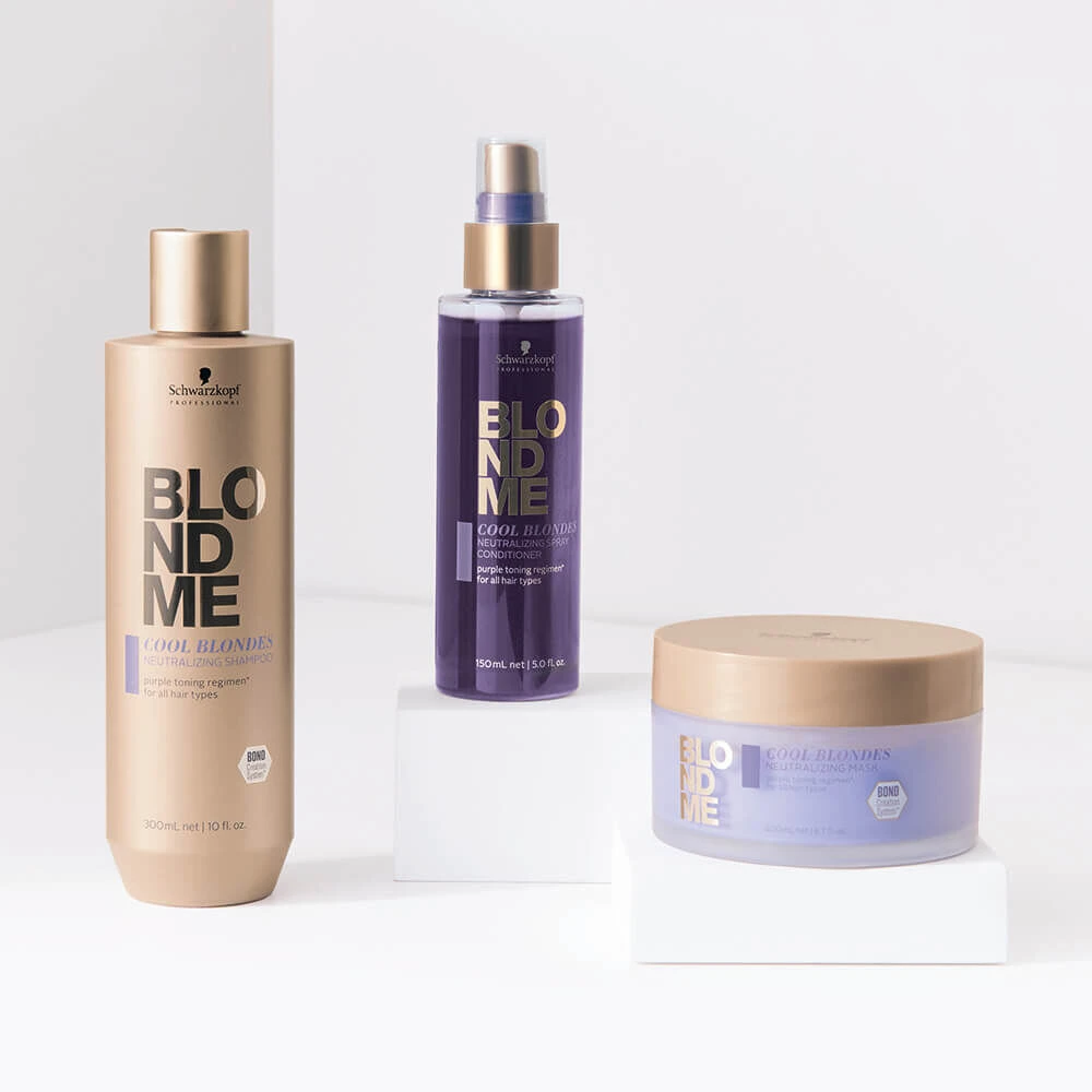 The Cool Blondes Neutralising Range with 3D Bond Creation Technology helps to build new bonds. The purple toning formulas help to remove brassiness, enhance cool tonal directions and neutralise yellow undertones.
