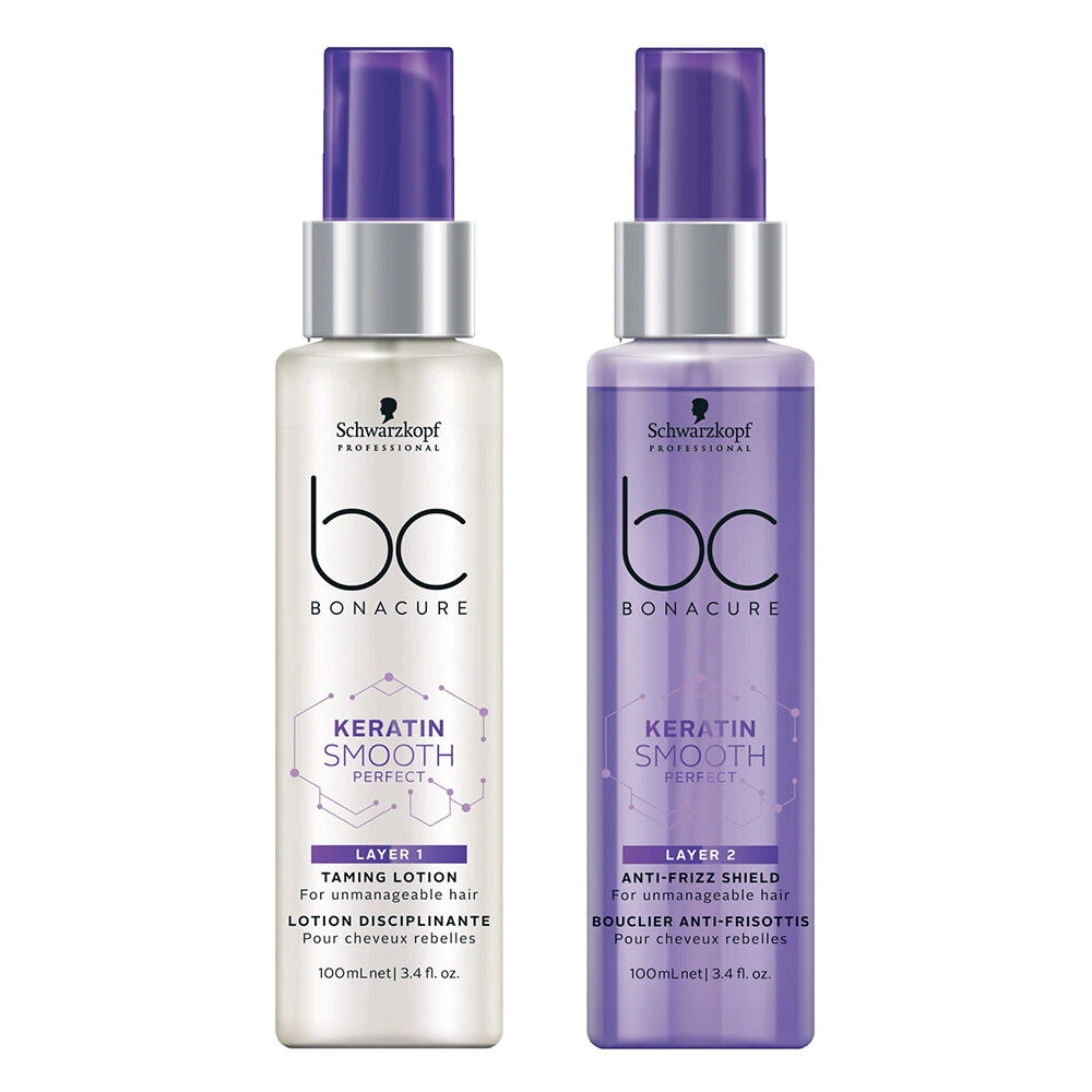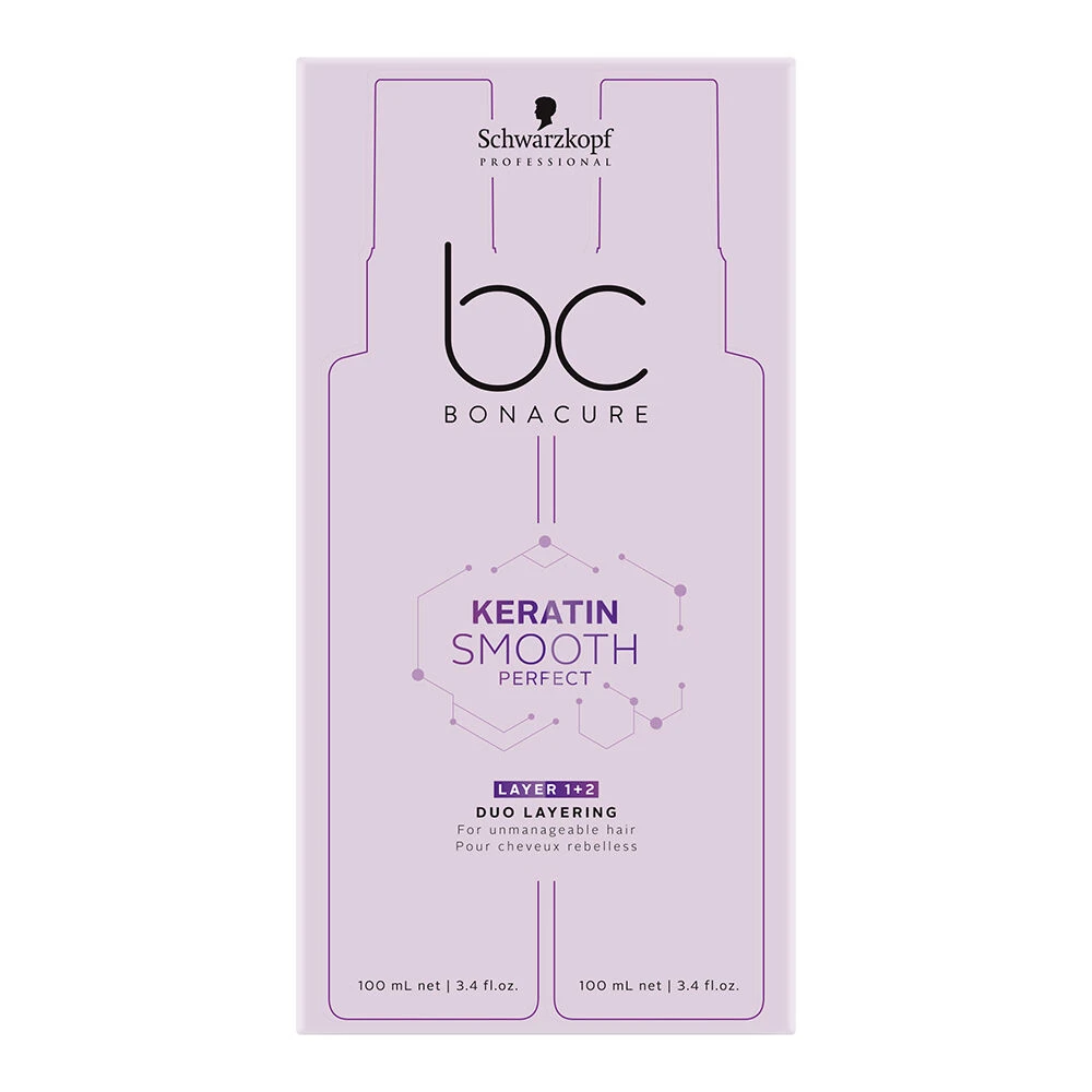 The Schwarzkopf Professional Bonacure Keratin Smooth Perfect Layer 1+2 Duo Treatment (2 x 100ml) is a two-phase treatment consisting of a Taming Lotion and an Anti-Frizz shield to smooth the hair’s surface, protect against heat and mechanical damage, and tame frizz for up to 72 hours. The nourishing Taming Lotion is infused with hydrolysed Ketatin to help increase manageability. Keratin is deposited on the rough parts of the hair to smooth the hair’s surface and seal in nourishing care agents. The weightless Anti-Frizz oil is enriched with Silicone and Babassu Oils to tame unwanted frizz, protect the hair against heat (up to 210°C / 446°F) and boost shine to the max without overburdening. Cell Perfector Technology provides additional care for all hair types, repairing both the inside and outside the hair’s structure to promote increased strength and elasticity.