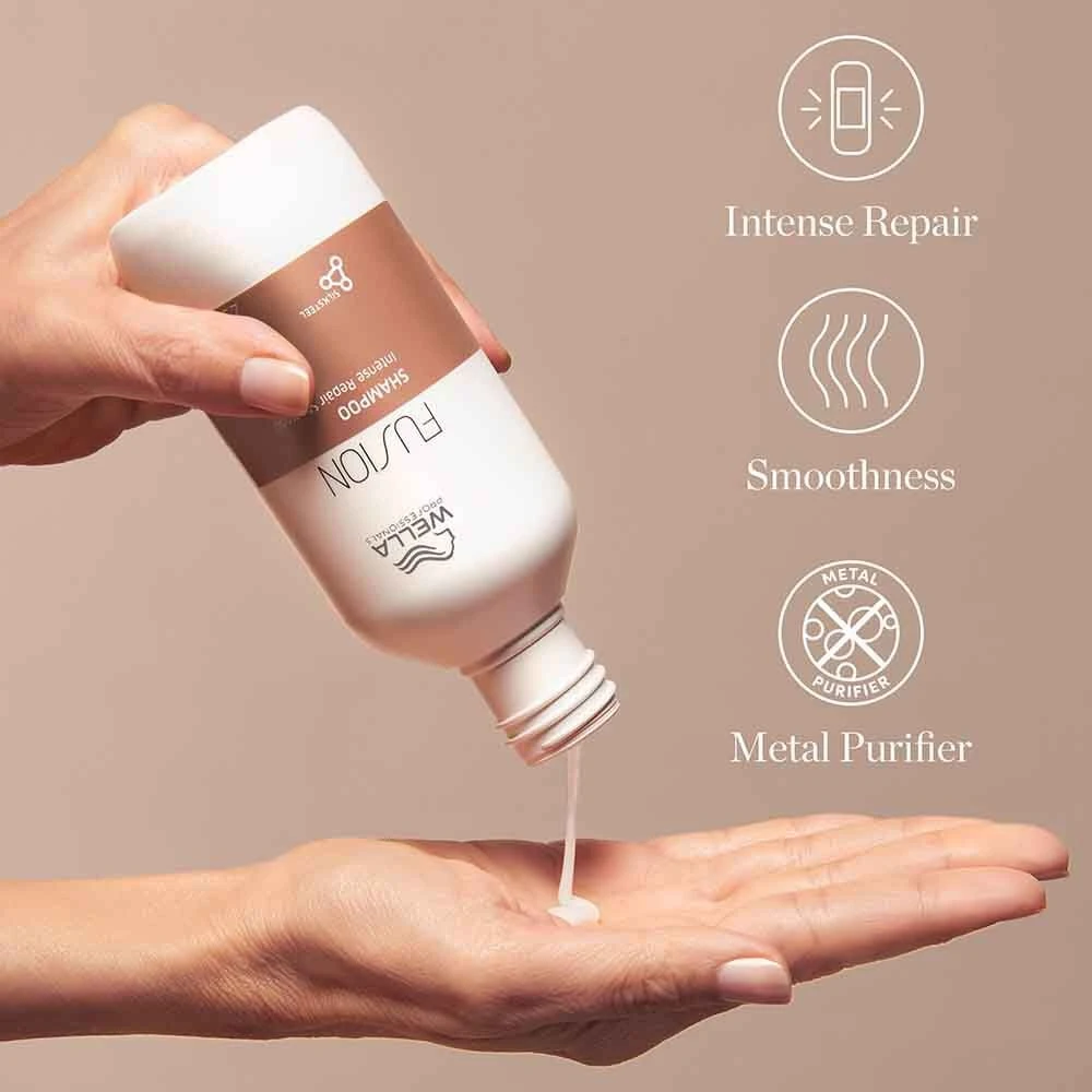The next dimension in intensive hair repair from Wella Professionals providing up to 95% more resilience against breakage* with the Fusion Intense Repair Range. Gently cleanse and increase hair resilience against breakage caused by combing or any mechanical damage with the Wella Fusion Intense Repair Shampoo for damaged hair. Inspired by spider silk, one of nature’s strongest fibre, this delicate professional shampoo has been formulated with silk amino acids and intense conditioning ingredients, to help repair hair whilst also leaving it clean and cared for at the same time, leaving you with smooth silky hair.